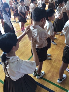 今朝の集会は、縦割り班に分かれての、背中伝言ゲームです。お題は「あめ」でしたが、最後の人まできちんと伝わった班はありませんでした。なかなか難しかったようですが、わからない低学年の児童に、年上の児童が優しく何度も書いてあげる姿などが見られました。