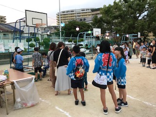 かき氷、スマートボール、輪投げなど、ワクワクするお店がたくさん。子どもたちは夢中です。でも、踊りも忘れないでね。