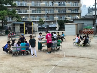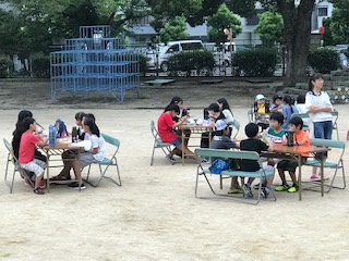 力を合わせて、保護者の方と6年が作ったカレーをみんなで食べています。お腹ペコペコ。美味しいカレーに、みんな笑顔いっぱいです。ちなみに、甘口と中辛があります。