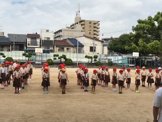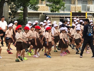 全体練習の1回目です。並び方、足踏みが全員そろうように基本的練習です。初めての1年生も、周りを見ながら、しっかりがんばっています。気をつけでは、まっすぐ美しく、みんなの心が一つになりました。