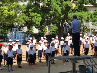 全体練習後、校長先生から話がありました。明日の大阪880万人訓練についてです。大阪府下で明日の11時頃、一斉に大津波警報下を想定した放送が、屋外スピーカーなどから発信されます。明日は、学校でも放送を聞き、それぞれがどうすればよいか考えます。校長先生の話から、災害時だけでなく常日頃から、あらゆることに対していつも自分はどうするか考え、行動することの大切さについても学びました。