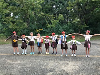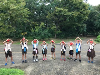 雨が上がって、午後からオリエンテーリングをしています。チェックポイントでは、大きな栗の木の下で歌いながら、班で考えたダンスを可愛らしく踊っています。