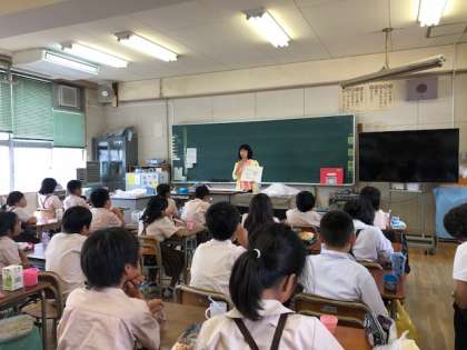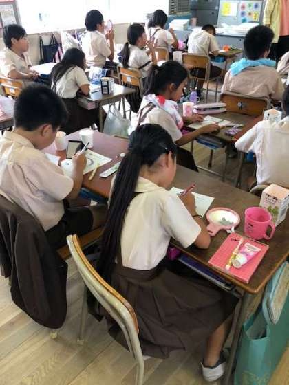 2時間目に、歯垢染め出しをしました。虫歯を放っておくとどうなるかを勉強した後、お薬を使って染め出しを行いました。普段ていねいに磨いているつもりでも、奥歯や、歯と歯の間などは、なかなか磨くことができていないことがよくわかりました。