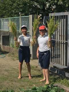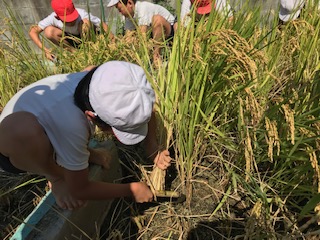 春に田植えをした稲が育ち、今週収穫をしました。鎌を使って、稲刈りをした子どもたちは、たくさん収穫ができて、とても満足気でした。これから天日干しをし、脱穀をします。