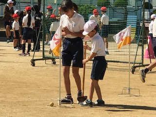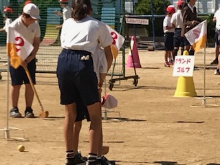 芋掘りの後、遊びコーナーで、様々な遊びを当日に向けて練習しました。グランドゴルフでは、6年が低学年に優しく教える姿も見られました。