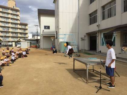 今日は、なわとびが得意な6年生児童が、全校児童の前で