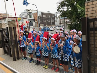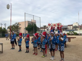無事な巡行を願って、いつも学んでいる校舎にまずお手打ち。次は、玄関で願いをこめて、祈る子どもたち。みんな仲良く、幸せに。
