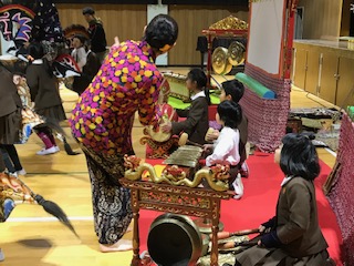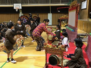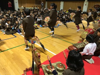 低学年が体験している馬踊りの音楽は高学年ががんばりました。初めてとは思えない上手な演奏でした。観ている児童も、手拍子で参加。会場は思った以上に盛り上がりました。