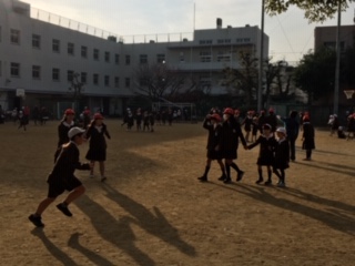 今日の遊びは、手つなぎ鬼です。鬼同士、友だちと仲良く手をつないで追いかけるのですが、なかなか自由に動き回ることができず、高学年児童でも捕まえるのに苦労していました。