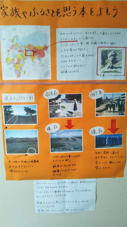 国語で学習する教材に関連のある図書を調べて、補助教材になるような壁新聞を作って廊下に掲示してくださったりもしています。下の写真は、4年生の国語「せかいいちうつくしいぼくの村」に関係した掲示物です。豊かな読書環境をつくってくださっていることに感謝しています。