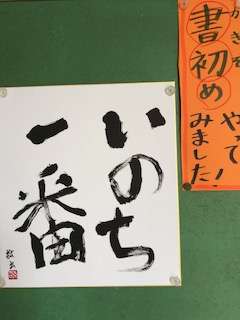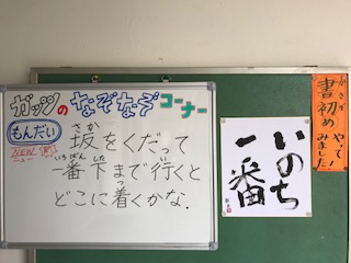 新しいなぞなぞと一緒に校長先生の書き初めが掲示されました!今年もいのち一番に、と願いが字に込められています。しっかり校長先生の願いと文字は、子ども達の心にしっかり刻まれたことでしょう。