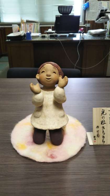 3学期の始業式から、玄関入って左手の展示コーナーに、信楽の土で陶器の人形「つちびと」をつくっておられる可南さんという作家の「光の粒 きらきら」という作品を飾っています。子どもが未来に向かって夢を大きく膨らませていくような感じが素敵で、学校の子どもたちにも見てほしいと思い、持ってきました。