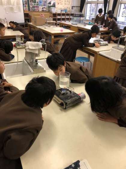 理科の学習では、水の温まり方の実験を行いました。ビーカーにお味噌を入れ、水がどのように温まっていくかを視覚的に見ながら学んでいます。