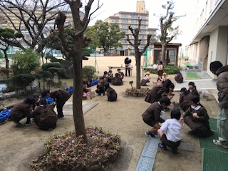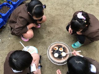 昔の道具の学習で、七輪の火起こし体験をしました。火がついた時には、大喜びで歓声をあげていました。おもちを焼きましたが、美味しそうです。