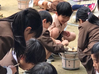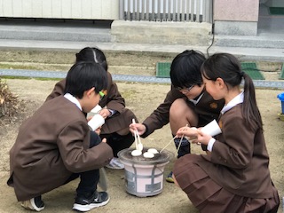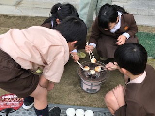 おもちをグループみんなが仲良く楽しく焼いています。こんがりやけて、ぷっくり膨れて、表面がパリッと割れた時は、にっこり笑顔もはじけていました。今は、便利な道具がたくさんありますが、昔の道具は人のふれあいもつくることが、できたのかもしれませんね。