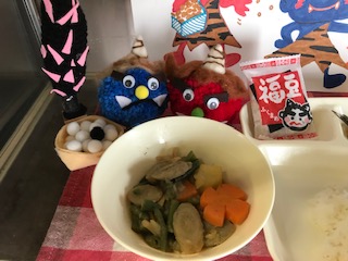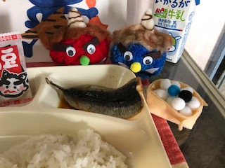 鬼さんもおいしそうにおかずを見ています。あれ?鬼さんもいわしを食べたそうにしてますね。さすが、調理員さんの愛情たっぷりのお料理には、力持ちの鬼さんも勝てないようです。今日もしっかり子ども達は給食をたべました。