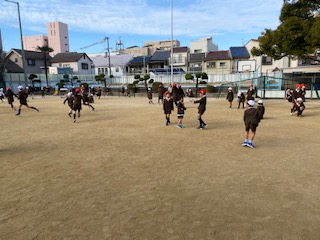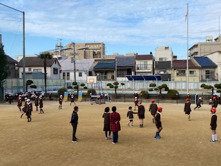 今朝の遊びは、こおり鬼ごっこでした。狭い空間の中、巧みにタッチの手をかわしながら逃げる児童もたくさんいました。