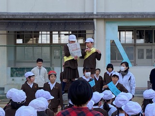 遊びの後は、計画委員会からのあいさつの奨励がありました。「いつでも どこでも 自分の最高の挨拶をしよう」という言葉をキャッチフレーズに、先月初め、あいさつ週間がありました。その後、継続することができているでしょうか。今朝は、学年ごとに、全員であいさつをしてみました。1年生から3年生は、大きな声で元気なあいさつをすることができました。これからも続けて欲しいと思います。