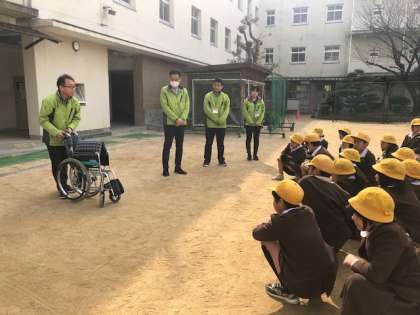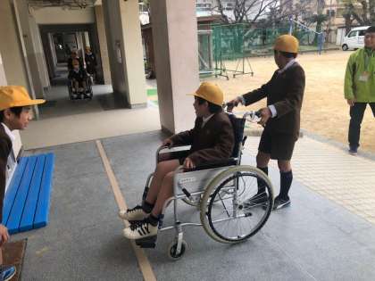 3時間目に社会福祉協議会の方に来てもらい、車イスの使い方や乗り方について教えていただきました。車イスに使うときには、移動する際に「前に進みます。」と声をかけたり、坂道やスロープを下るときにバックしながら下ったりすることが大切だと学びました。また、乗るときにはイスに深く座ることや肘置きをしっかり掴むことなどが大切だと学びました。