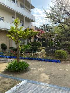 さて皆さん。毎朝登校してきたとき、玄関に入ってまず目にするのは、この写真の景色ですね。毎朝見ているのですから簡単だと思いますが、正面の石碑には何という言葉が書かれているでしょうか?