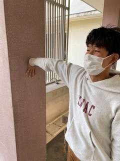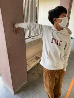 1:写真のように手を逆さまに壁につきます。
