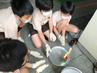 6年生が理科の「物の燃え方」の学習をしました。缶に穴が空いていない時と穴が空いている時では、全く違う燃え方をしていました。なぜ、穴が空いているとよく燃えるのでしょう。次回の理科の時間にみんなで考察していきます。