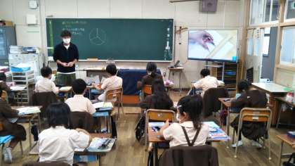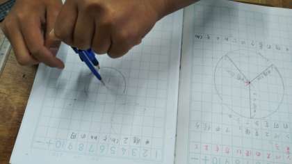 教科書も下の本に入りました。本時は、コンパスの使い方に慣れながら、円の中心と半径について学んでいるところです。初めて使うコンパスは、見本の映像のようにはすんなりといかないようで、悪戦苦闘する子どもたちです。コンパスをまっすぐ立てすぎると滑らかに動いてくれず、斜めに傾けすぎると中心から針が離れてしまいます。それでも、やる気満々でいくつも円を描いていました。そして、「これって、なかなか便利ですごい道具だなあ」という子どもたちのつぶやきが聞こえてきました。