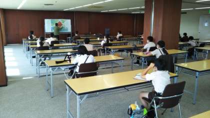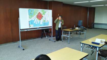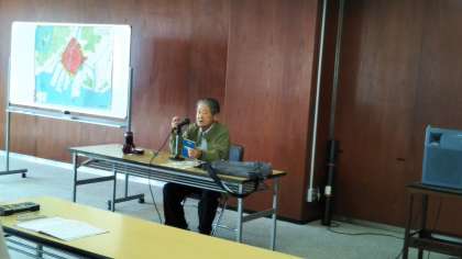 中國新聞社の会議室をお借りして、豊永恵三郎さんから原爆が落ちた8月6日のことをお聞きしています。