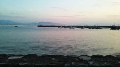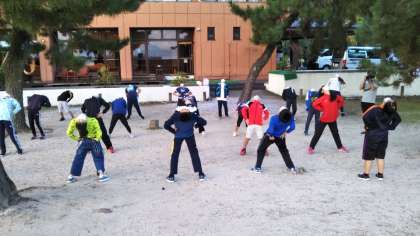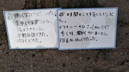 おはようございます。今日もいい天気です。みんなしっかり眠って、元気です。ホテル前の浜辺で海を見ながら、朝の集いを行いました。ラジオ体操をして、班長会議の反省点をみんなで確認しました。