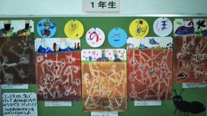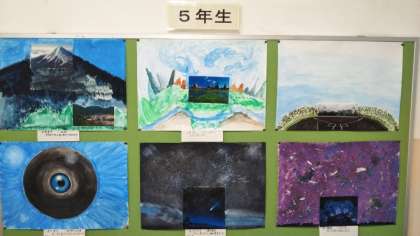 下の写真は、1年と5年の学年掲示板です。1年生はアリの巣を描いていますが、それぞれの絵にアリの生活の物語があります。5年生は、絵の中に張り付けた写真から広がる幻想的な絵です。想像力を豊かに、どんどん表現していってほしいです。