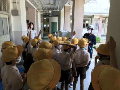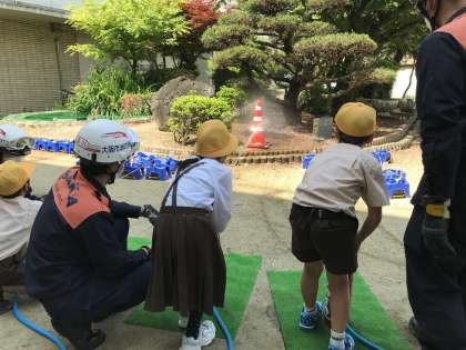 消防署の人たちの指示に従って、一人ずつ標的に向かって、勢いよく消火する体験ができました。