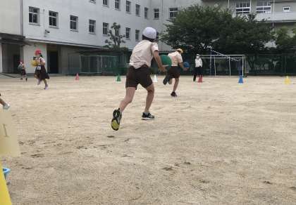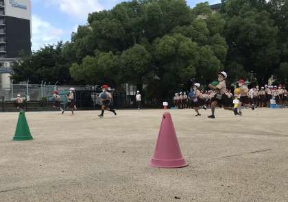 今日のゲームは、縦割り班対抗ボール運びリレーでした。低学年は両手で、高学年は片手でボール運ぶというルール。子どもたちは、ボールを落とさないように必死なって活動していました。