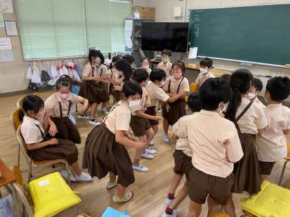 雨で外遊びができないので、教室の中でフルーツバスケットをしました。