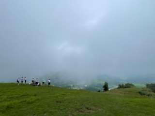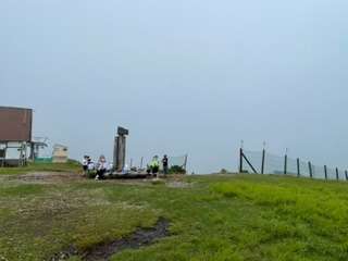 鉢伏山山頂に到着しました。途中危険な道もありましたが無事に登頂です。霧が多く寒いですが、子どもたちは景色を見ながら、アクエリアスで乾杯しました。