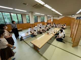 宿舎で最後の食事です。メニューは炊き込みご飯とスープ、お漬物です。食事係さんからのいただきますの前にクイズがありました。「山に登った人が必ずすることはなんでしょう?」です。みなさんはわかりますか?