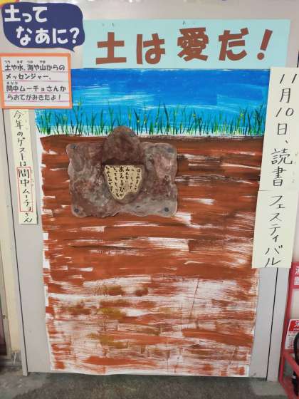 11月10日(木)に絵本作家の間中ムーチョさんにお越しいただき、「読書フェスティバル」を行います。それに先立ち、図書室の近くには、「読書フェスティバル」に向けてさまざまな掲示をしています。階段には間中さんの紹介、図書室前には直筆メッセージやイラストが飾っています。「読書フェスティバル」では、子どもたちを物語の主人公として、土のお布団(間中さん作の模造紙)に寝転んで語りかけや質問を聞きながら土に変身していったり、『にんげんさまへ』の読み聞かせを聞いたりと楽しい時間となっています。間中ムーチョさんの来校を楽しみにしています。