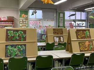 子どもたちは原画に触れながら鑑賞し、紙と絵の具だけでなくさまざまなものを使いながら立体的な作品になっていることに驚いていました。