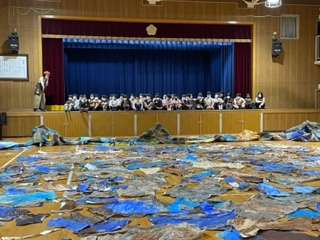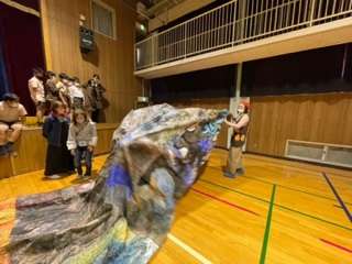 そして、「アリ」になる個展で使われた大きな作品を潜り抜けて『にんげんさま』の読み聞かせが始まりました。その際に、この本が作られた経緯や福島県の原発についてもお話ししていただき、子どもたちは真剣な眼差しで聞いていました。