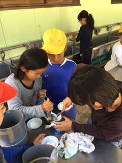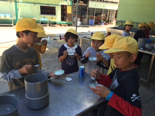 空き缶にホイップクリーム、牛乳、砂糖、バニラエッセンスを入れてしっかり蓋をします。それを大きな筒状の入れ物に入れ、氷と塩を周りに詰め、ひたすら30分間、ころがし続けるとアイスクリームのできあがり。