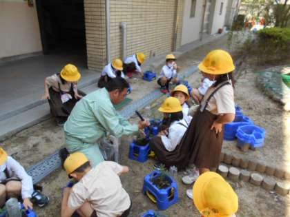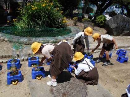 また、学習園では、さつまいもの苗ツルを2人一組で植えました。収穫は10月ごろになりますが、子どもたちは楽しみにしています。