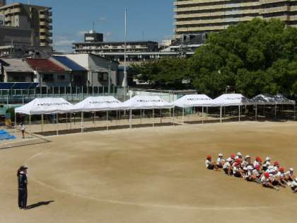 今年は、練習中、とても日差しが強く暑い日が多かったので、児童席にもテントを張り、暑さを和らげることに努めました。