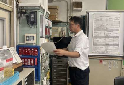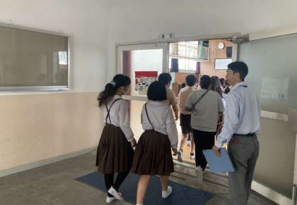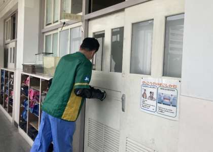 不審者役の方が校内を回り、教室のドアをノックしている様子です。