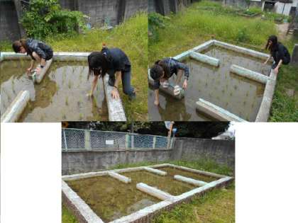 先日、5年生が総合の時間に田植えをしました。イネの根がはるのがなかなかのようです。栃尾先生と梶谷先生が倒れている苗を植えなおし、無事完了しました。これからも、水の管理をしながら育てていきます。