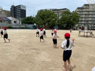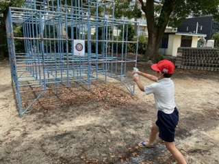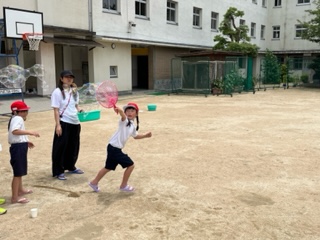 後半には、水風船を使ったキャッチボールや鬼ごっこ、シャボン玉をしました。とても暑い中でしたが、ルールを守って、楽しく、工夫しながら遊ぶことができました。