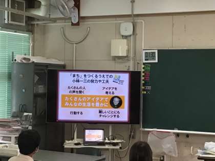 阪急電鉄をつくった小林一三さんが100年以上前におこなったまちづくりの夢や工夫を聞き、その後、自分たちの夢について考えました。