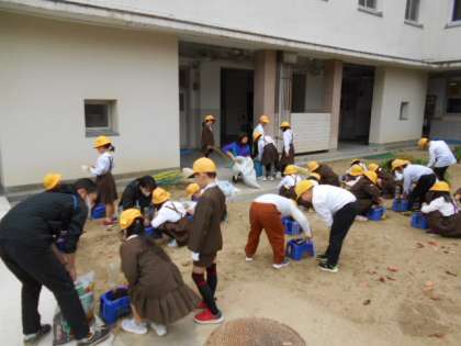 新しい土を入れて、チューリップ(1年生)、スイセン(2年生)の球根を植え、大切に育てていきます。