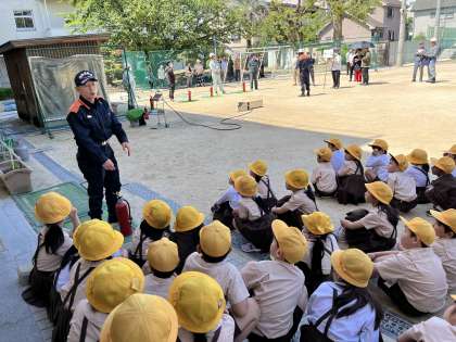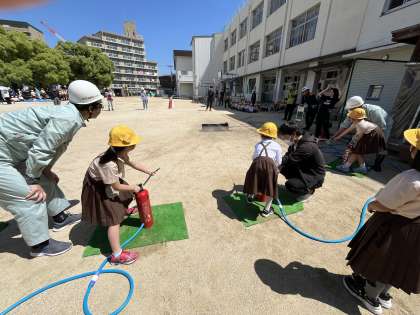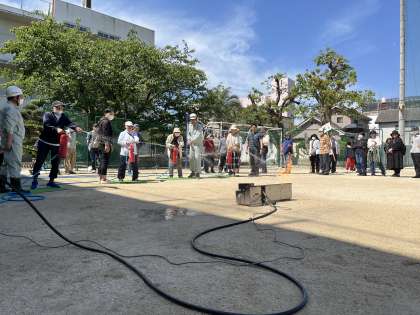 地域の方と一緒に水消火器を使って火を消す体験訓練をしています。