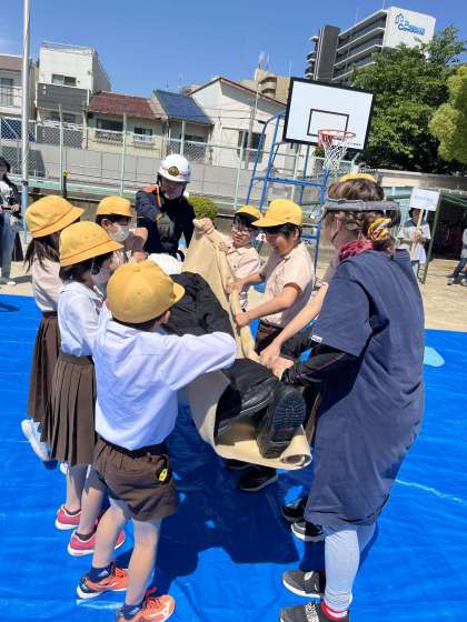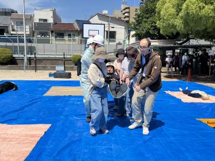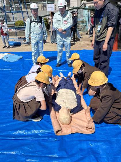 地域の方と一緒に負傷者を毛布を使って運ぶ体験活動をしました。
