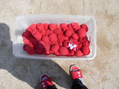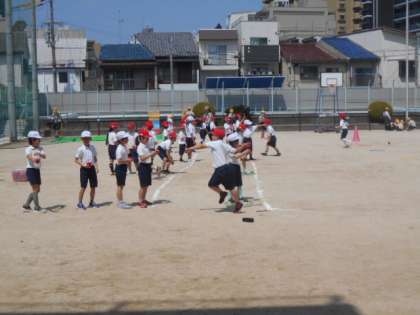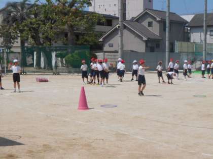 玉入れの紅白玉を使い、遠投の練習をしました。