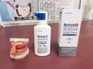 マウスピースを使って、フッ化物の塗布を行いました。フッ化物を塗布することによって、生えたての永久歯をむし歯になりにくくする効果があります。